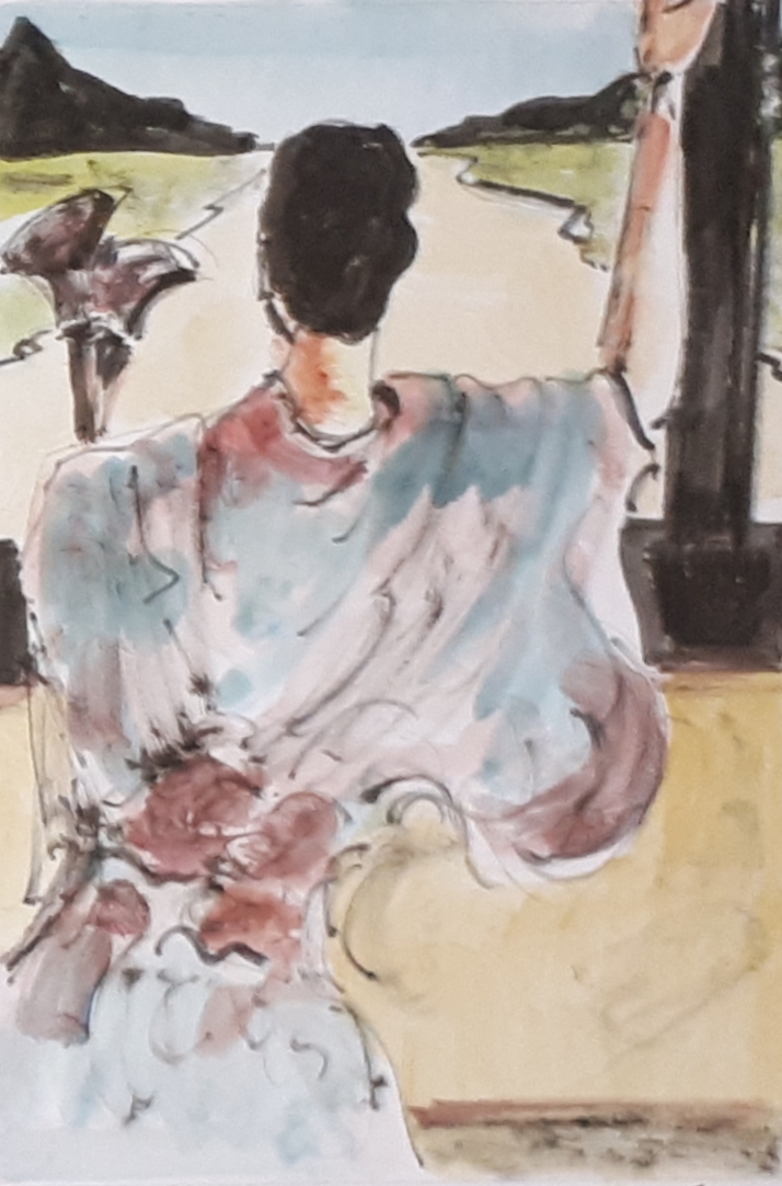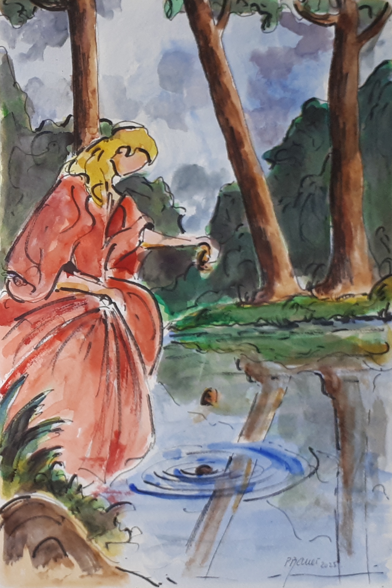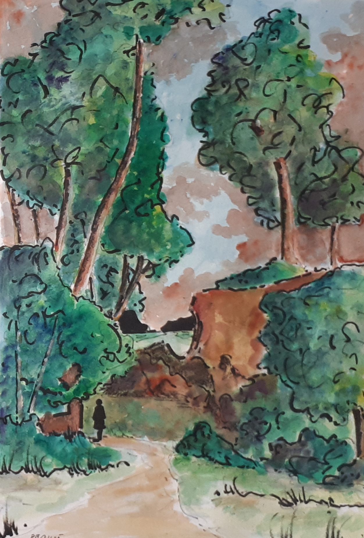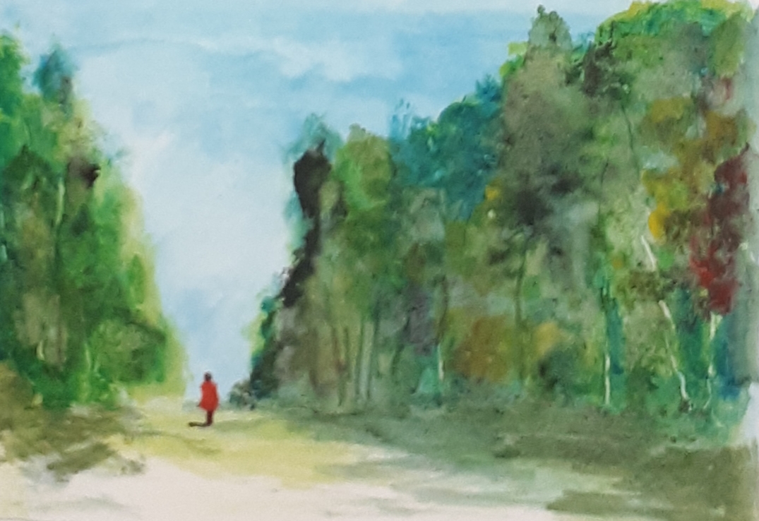Seule en forêt 01 / Aquarelle et encre / 30 x 50 |